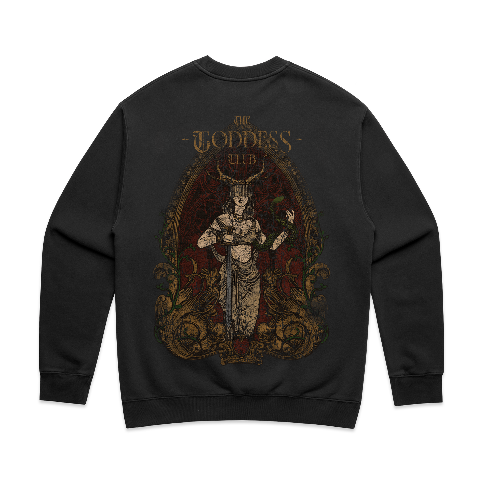 Our Rebirth sweatshirt showcases our club logo on the front, the back is adorned with a powerful, exclusive illustration, created through a soulful collaboration with an artist who captured the spirit of our community, embodying the essence of transformation and divine feminine strength.